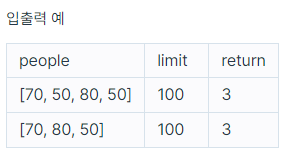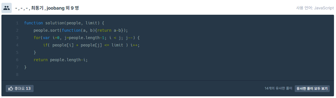 | // 프로그래머스 - 구명보트 function solution(people, limit) { // 내림차순으로 정렬 people.sort((a, b) => b - a) // 구명보트 사용할 때마다 +1 해줄 변수 cnt 선언 let cnt = 0 // left, right 인덱스 선언 let left = 0 let right = people.length - 1 // left 인덱스가 right 인덱스보다 작거나 같으면 while문 계속 실행 while(left <= right) { let sum = people[left] + people[right] // 보트에 두명다 탈수 있으면 left, right 인덱스 모두 더하고 줄여준다 if(sum <= limit) { left++ right-- } // 한명만 탈수 있으면 left 인덱스만 +1 else left++ cnt++ } return cnt } |
