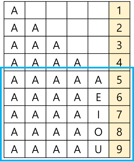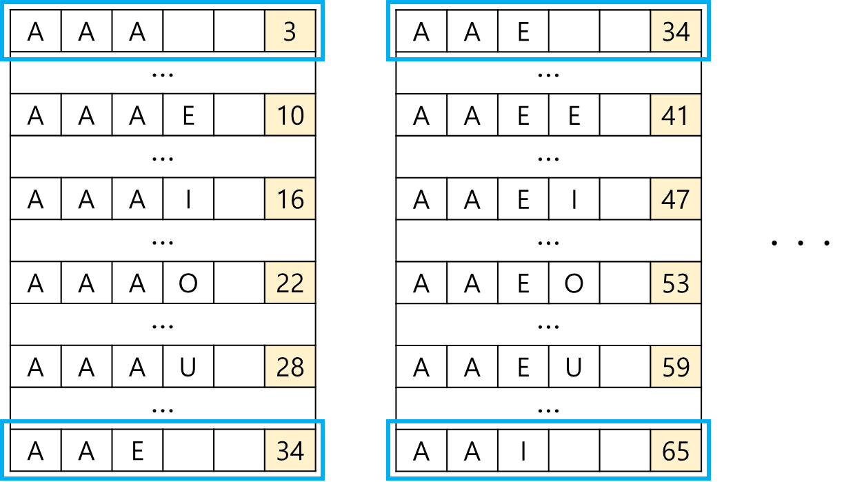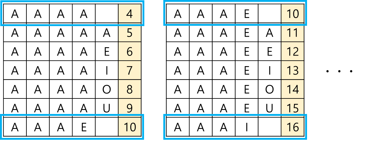사전에 알파벳 모음 'A', 'E', 'I', 'O', 'U'만을 사용할 수 있는, 길이 5이하의 모든 단어가 수록되어 있습니다.