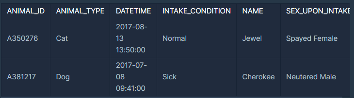 INSERT INTO ANIMAL_INS (ANIMAL_ID, ANIMAL_TYPE, DATETIME, INTAKE_CONDITION, NAME, SEX_UPON_INTAKE)