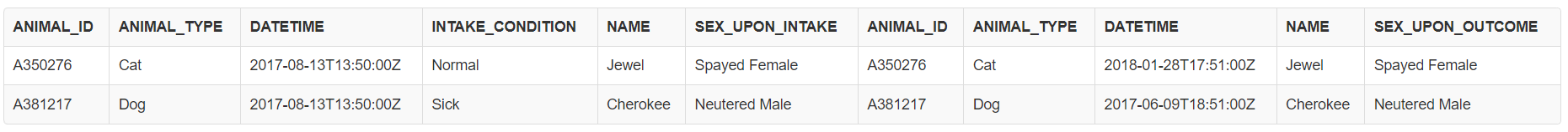 따라서 Figure 2에서 확인할 수 있듯이, ANIMAL_INS 테이블에 모든 데이터는 왼쪽 영역에 조회되었으며 ANIMAL_OUTS 테이블에서 ANIMAL_ID 같은 'ANIMAL_ID = A350276, A381217'만 오른쪽 영역에 조회되었다.