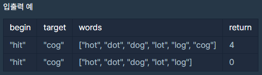 예를 들어 begin이 "hit", target가 "cog", words가 ["hot","dot","dog","lot","log","cog"]라면,