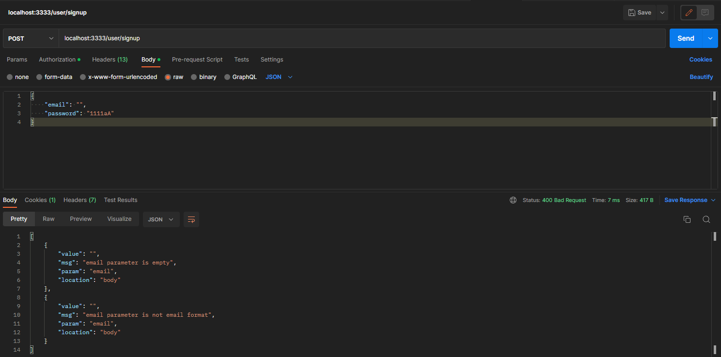 notEmpty() 및 isEmail() 함수 모두 통과하지 못해 2가지 에러가 발생했다.
