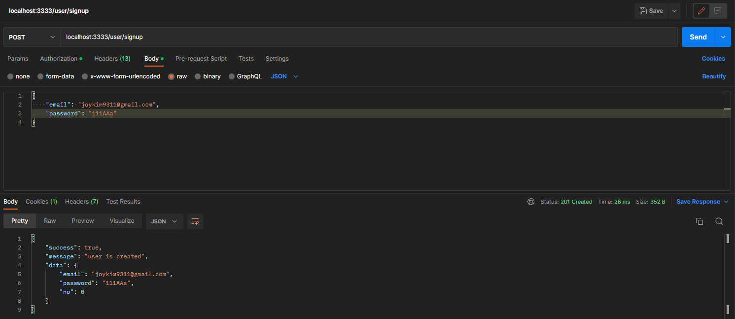 테스트가 진행될 POST 요청 예제는 '회원가입(signup)'으로 선택했다.