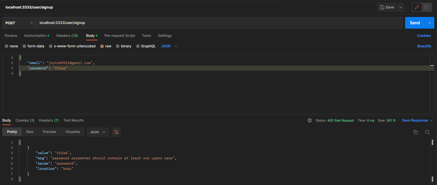 설계한대로 유효성 검사 기능이 구현되었는지 확인하고자 Postman을 사용하여 테스트를 진행했다.