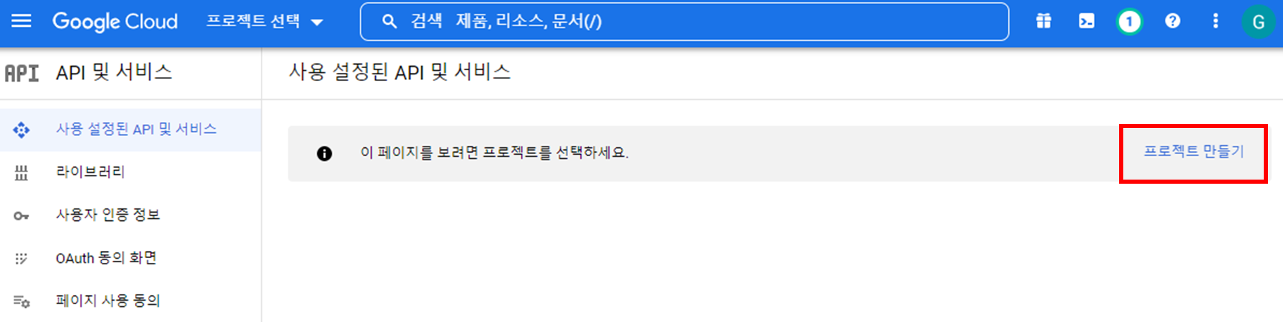 프로젝트 만들기를 클릭한다.