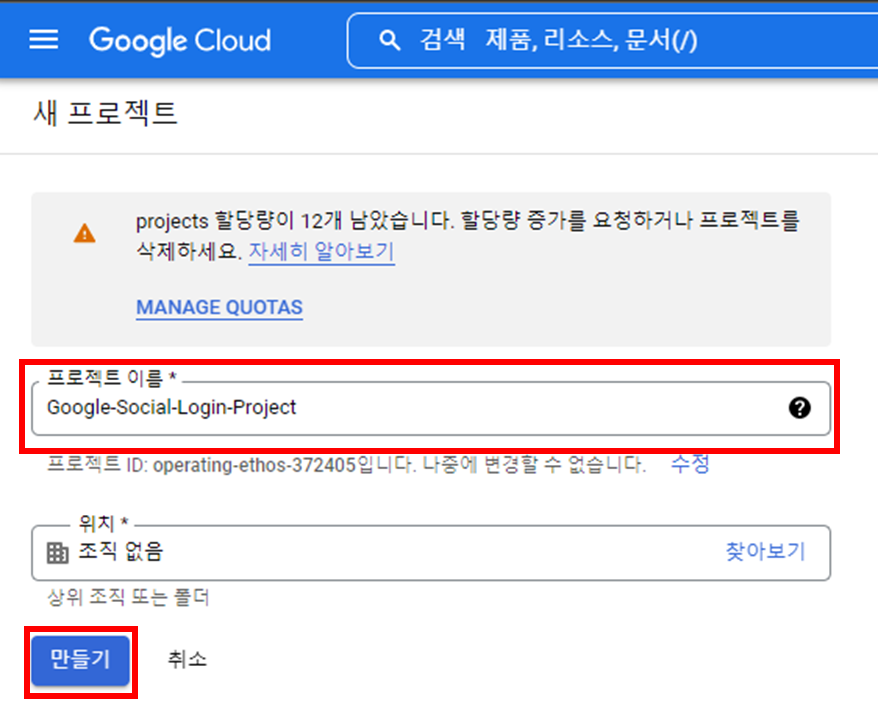 프로젝트 이름을 입력한 후 만들기를 클릭한다.