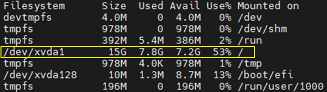 df -h 명령어를 입력해 스토리지 용량이 늘어난지 확인해보았다.