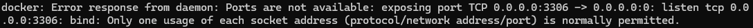 하지만 3306 포트가 이미 사용되고 있다며 에러가 발생했다.