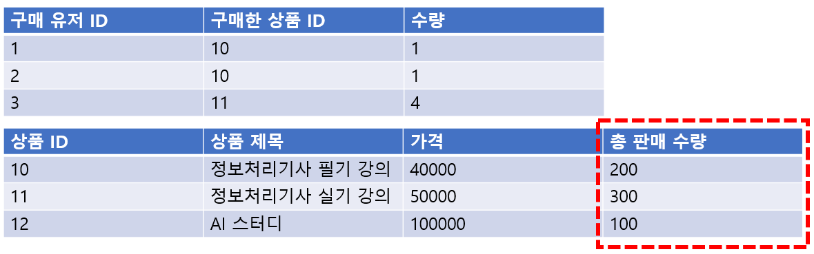 * 상품 주문 테이블을 집계 함수를 사용하면 상품별 상품별 총 판매 수량을 계산할 수 있으나, 성능 최적화를 위해 총 판매 수량을 상품 테이블에 함께 저장함